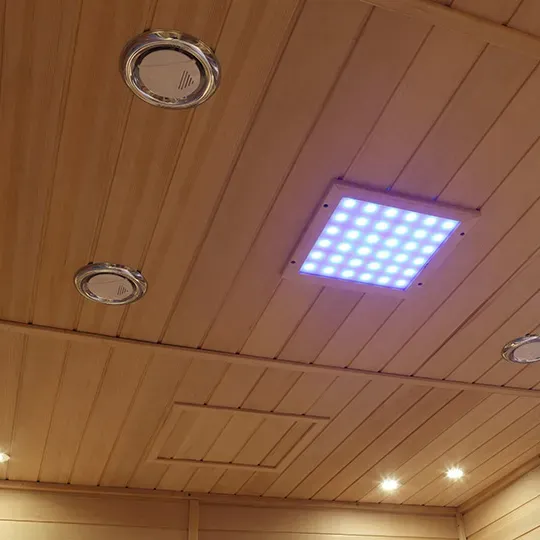 3. Karanasan sa Pag-init at Pag-iilaw: Ang pantay na distributed na malayong infrared na mga heating panel ay naghahatid ng banayad, tumatagos na init; itaas + gilid ambient na mga ilaw (sa mainit-init na tono) nagpapalakas ng pagpapahinga at maiwasan ang pagkabara o pang-aapi