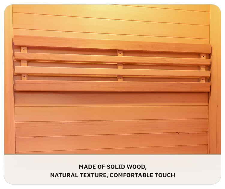 Dalawang premium Canadian woods, Hemlock at Red Cedar, ang napili. Ang kahoy ay matigas at matibay, na may malinaw na natural na texture at pare-parehong eleganteng kulay. Ang mga likas na katangian ng bawat piraso ng kahoy ay nagbibigay sa sauna ng kakaibang texture, na nag-iiniksyon ng natural at high-end na aesthetic na mga gene sa iyong home wellness space.indoor infrared sauna para sa bahay.