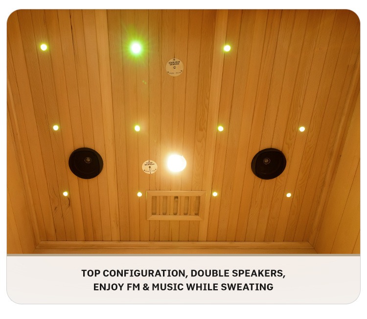 Ang isang dual-speaker system ay naka-configure sa itaas, na sumusuporta sa FM radio at pag-playback ng musika. Masisiyahan ka sa iyong mga paboritong melodies o mga programa sa radyo habang pinagpapawisan, ina-upgrade ang nakaka-engganyong karanasan sa sauna.