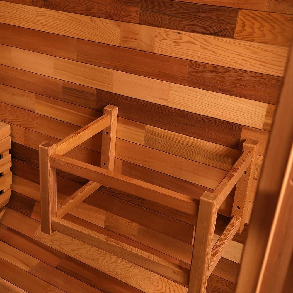 - Pangunahing Materyal: Ang de-kalidad na solidong kahoy na lumalaban sa init ay ginagamit sa buong lugar (mga pader, bangko, at frame ay solidong kahoy lahat), propesyonal na ginagamot para sa moisture at heat resistance upang umangkop sa mataas na temperatura at mataas na kahalumigmigan na kapaligiran sa sauna.