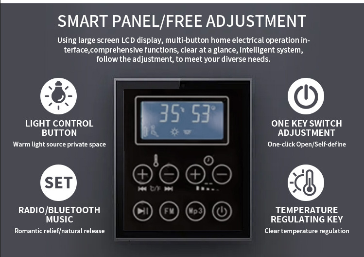 AngPanlabas na salamin na pinto panlabas na steaming roomay nilagyan ng isang panlabas na tukoy na malaking sukat na LCD intelligent na control panel (hindi tinatagusan ng tubig at dustproof na disenyo), na napagtatanto ang "one-key control" na maginhawang operasyon: