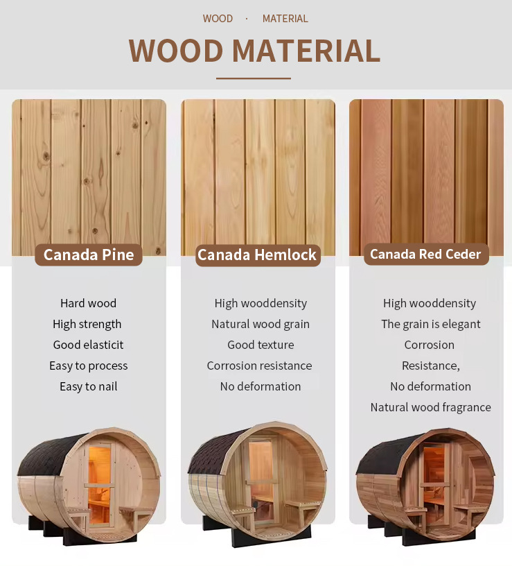 Mga Accessory sa Pagsubaybay at Karanasan: Sensitibong temperatura at halumigmig metro, log sand timer (timing + ritual sense), hand-polished wooden bucket at ladle, ibinabalik ang tradisyonal na sauna ritual sense habang tinitiyak ang maginhawang paggamit ngPanlabas na salamin na pinto panlabas na steaming room.